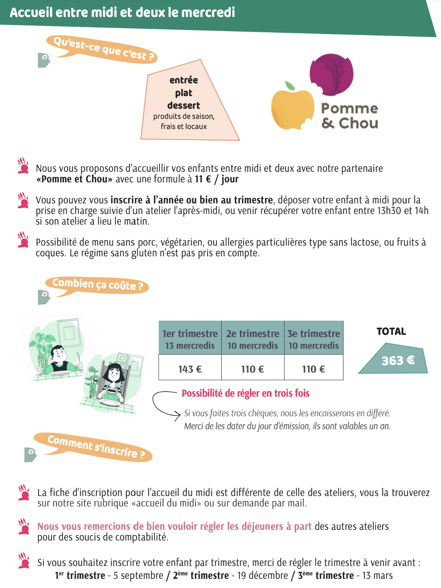 Accueil du midi Les mercredis nous vous proposons une prise en charge de votre enfant entre midi et deux Pour inscrire votre enfant à la cantine, il vous suffit de nous le préciser par mail à inscription@lesbateliers.com