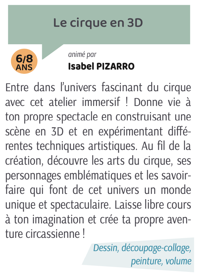 Ci-dessous, vous trouverez les différents stages créatifs que nous proposons durant les vacances scolaires.